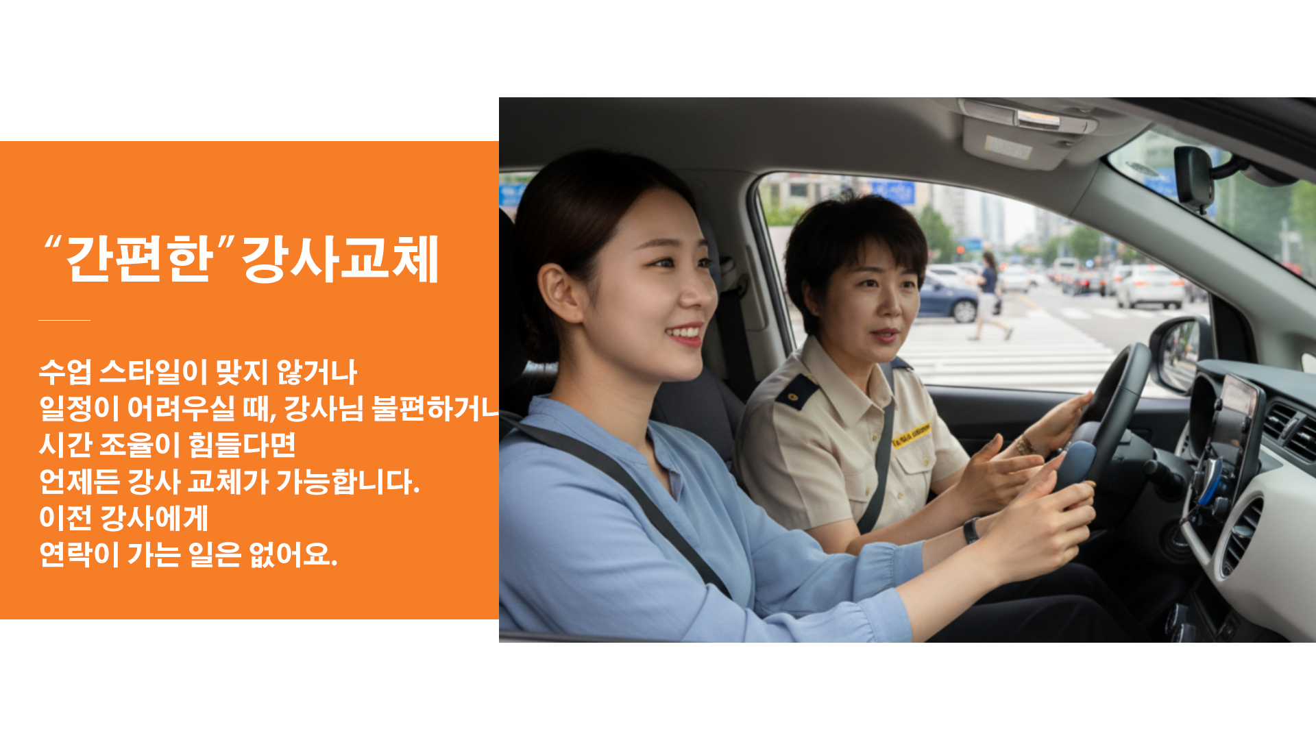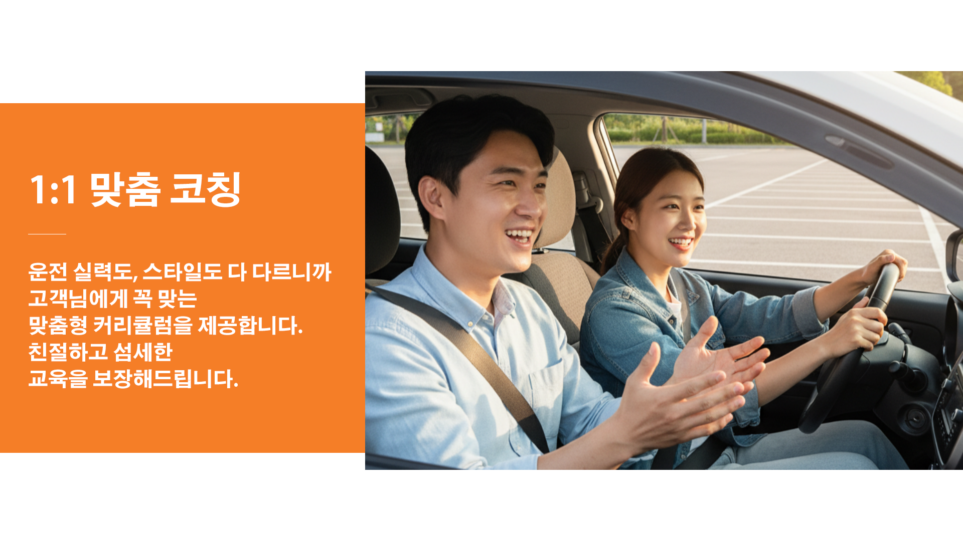 기본은 보조브레이크가 장착된 연수차로 진행되며, 자차 연수도 가능합니다. 자차로 진행할 경우 차량 상태와 보험 조건을 미리 확인하는 것이 좋습니다.